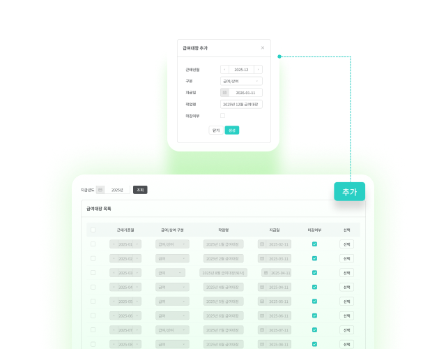 급여대장을 추가·삭제하고, 작업명을 지정하며, 급여·상여를 구분 설정하고, 지급일과 마감 여부를 관리할 수 있어요.