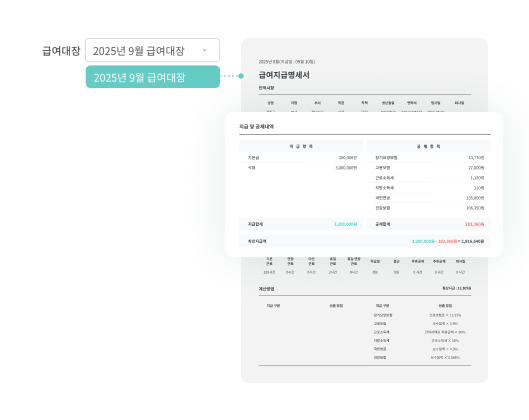 급여대장을 기준으로 급여명세서를 생성하고, 지급 항목과 공제 항목이 정확하게 반영된 명세서를 즉시 확인할 수 있어요.