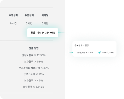 급여명세서에 (통상)시급을 표시하거나 숨김 처리하여, 근로자에게 필요한 정보만 전달할 수 있어요.