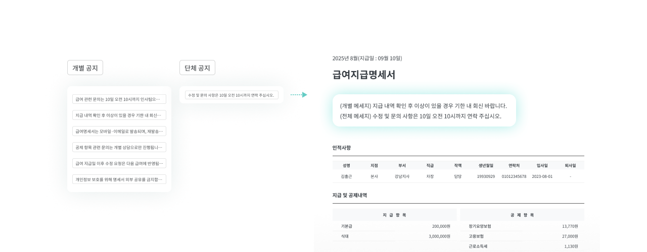 급여명세서에 단체 또는 개별 공지를 입력하여, 급여 관련 안내사항이나 변경사항을 함께 전달할 수 있어요.