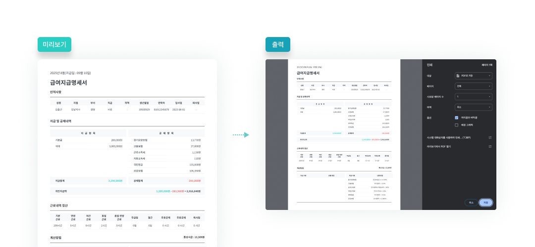 급여명세서를 미리보기·출력하고, 모바일 앱·
