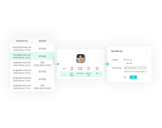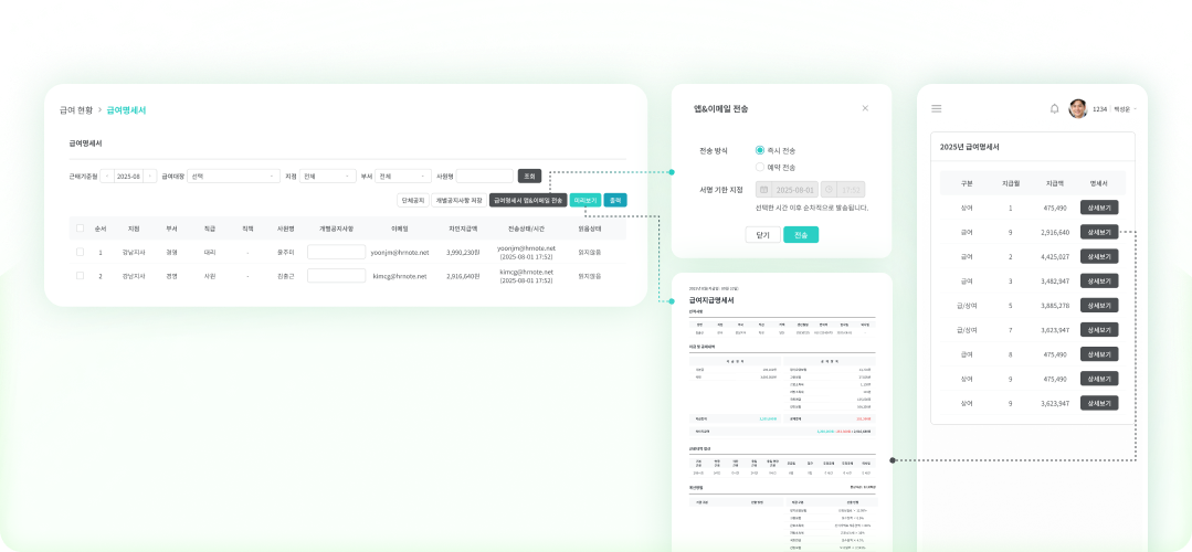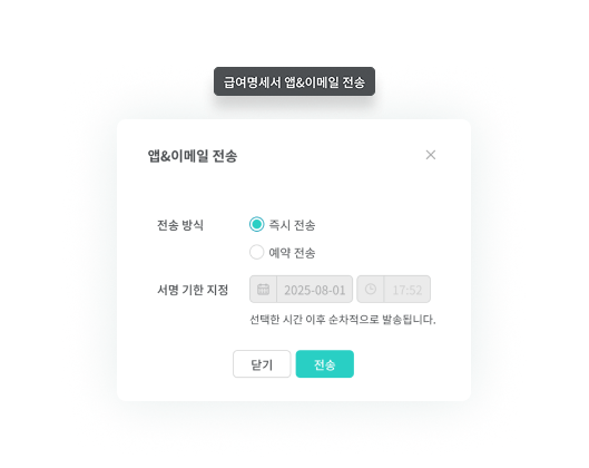 급여명세서를 앱 알림과 이메일로 즉시 전송하거나, 지급일에 맞춰 예약 전송하여 정해진 시간에 전달할 수 있어요.