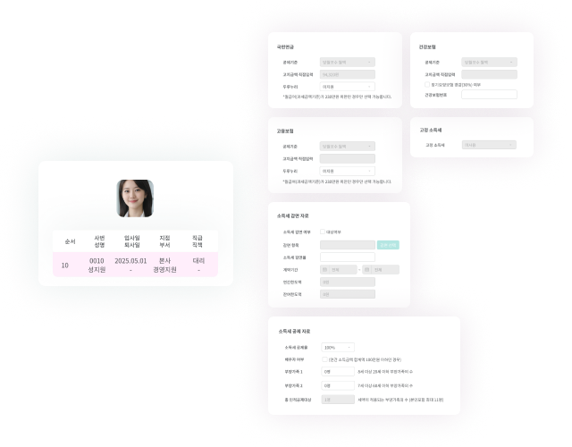 중도 입사자의 4대보험 익월·당월 공제를 정확하게 처리하고, 법 개정 시 공제율을 즉시 반영하여 법률을 준수할 수 있어요.