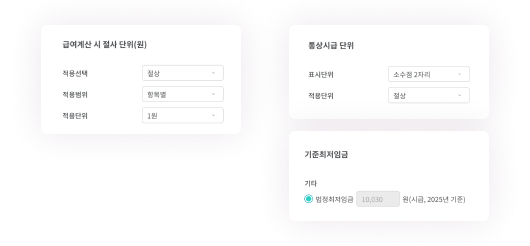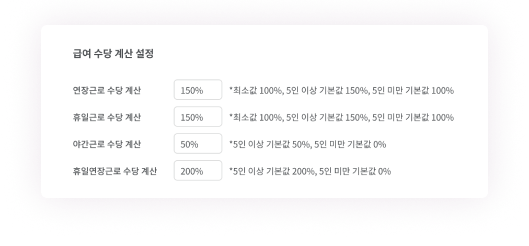 연장·휴일·야간·휴일연장 근로수당의 가산율을 항목별로 설정하고, 법정 기준에 따라 정확하게 계산할 수 있어요.