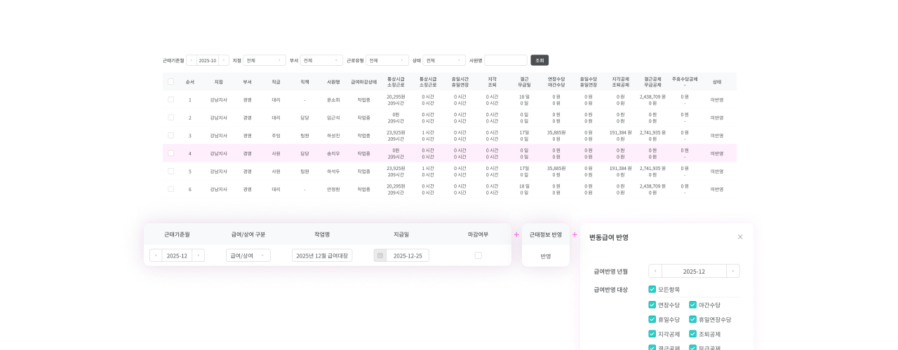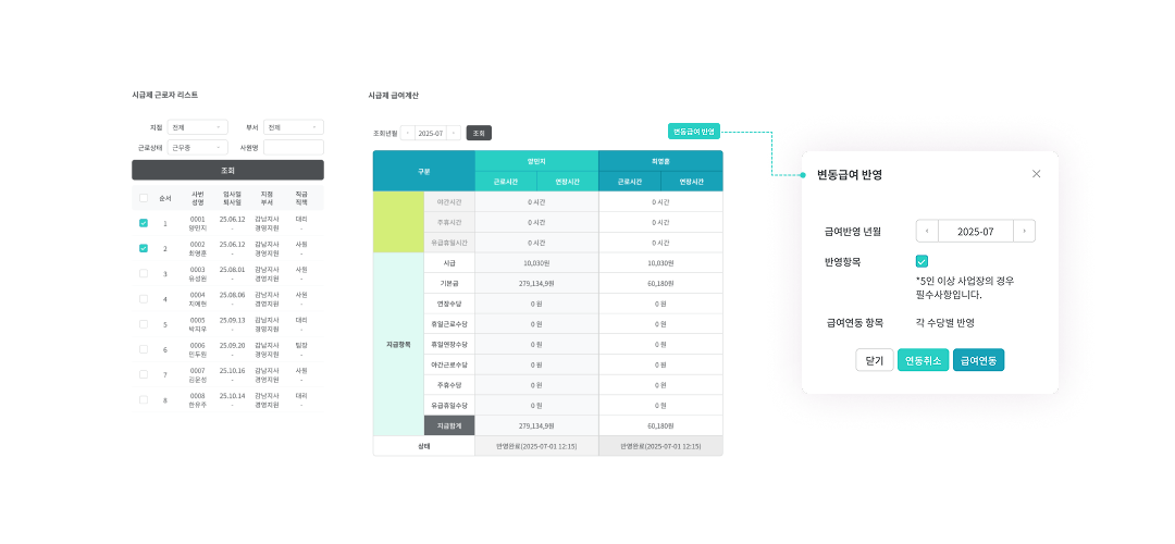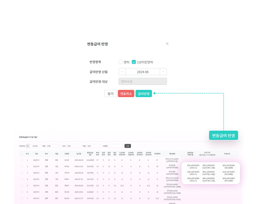 개별 사원의 고정급여와 변동급여에 근로내역을 실시간 연동하여 급여를 산출하고, 필요시 연동을 취소하여 수동 조정할 수 있어요.