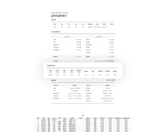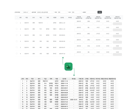 시급제 근로자의 근태기록·근태정산· 지급 항목과 연차수당 계산 내역을 엑셀로 다운로드하여 상세하게 분석할 수 있어요.