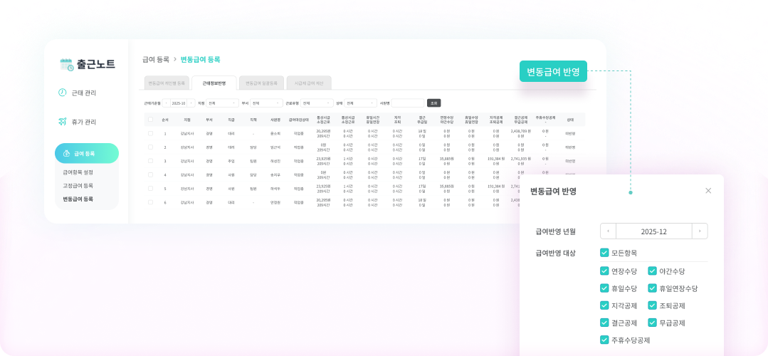 연차와 1년 미만 연차를 전체·선택 반영하여 수당을 계산하고, 계산 내역을 변동급여에 즉시 반영할 수 있어요.
