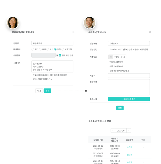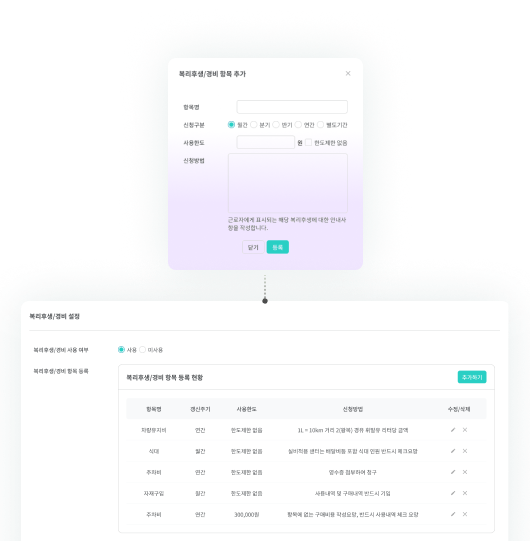 항목명, 갱신주기, 사용한도, 증빙서류 등을 정책에 맞게 추가하고 우리 회사만의 복리후생을 운영할 수 있어요.