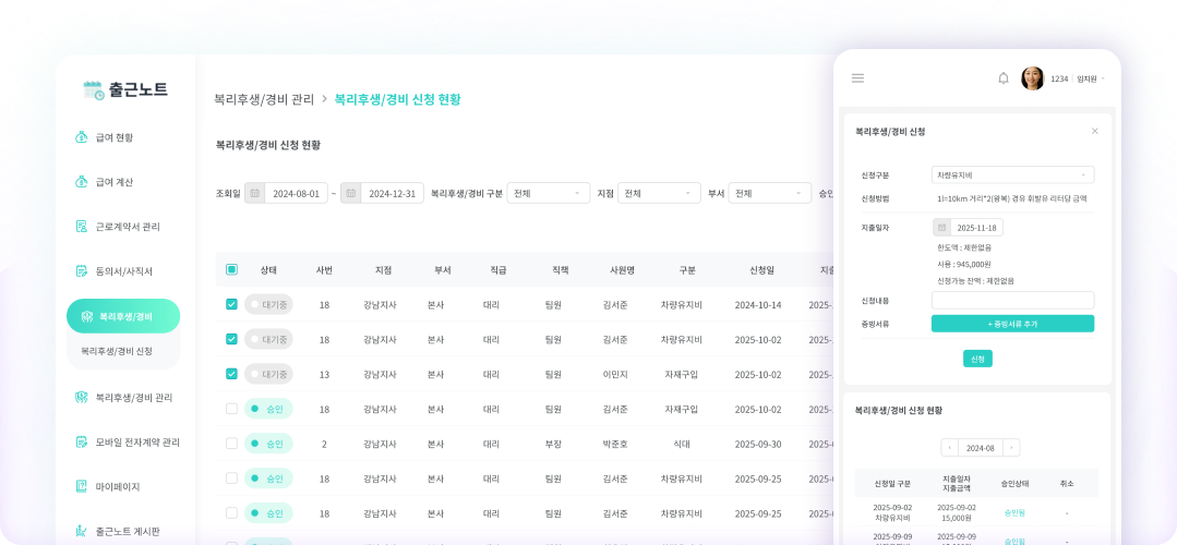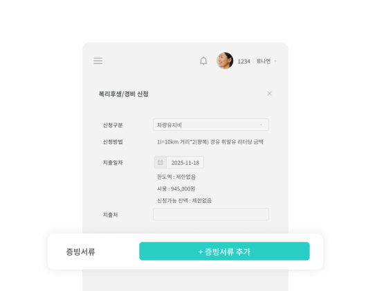 복리후생 및 경비 신청을 모바일앱에서 바로 처리하고 필요한 증빙서류도 즉시 첨부할 수 있어요.