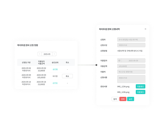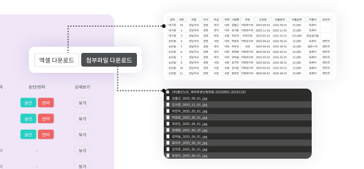 신청내역을 엑셀로 다운로드하고 증빙 첨부파일을 일괄 저장하여 정산 및 회계 처리 시간을 단축할 수 있어요.